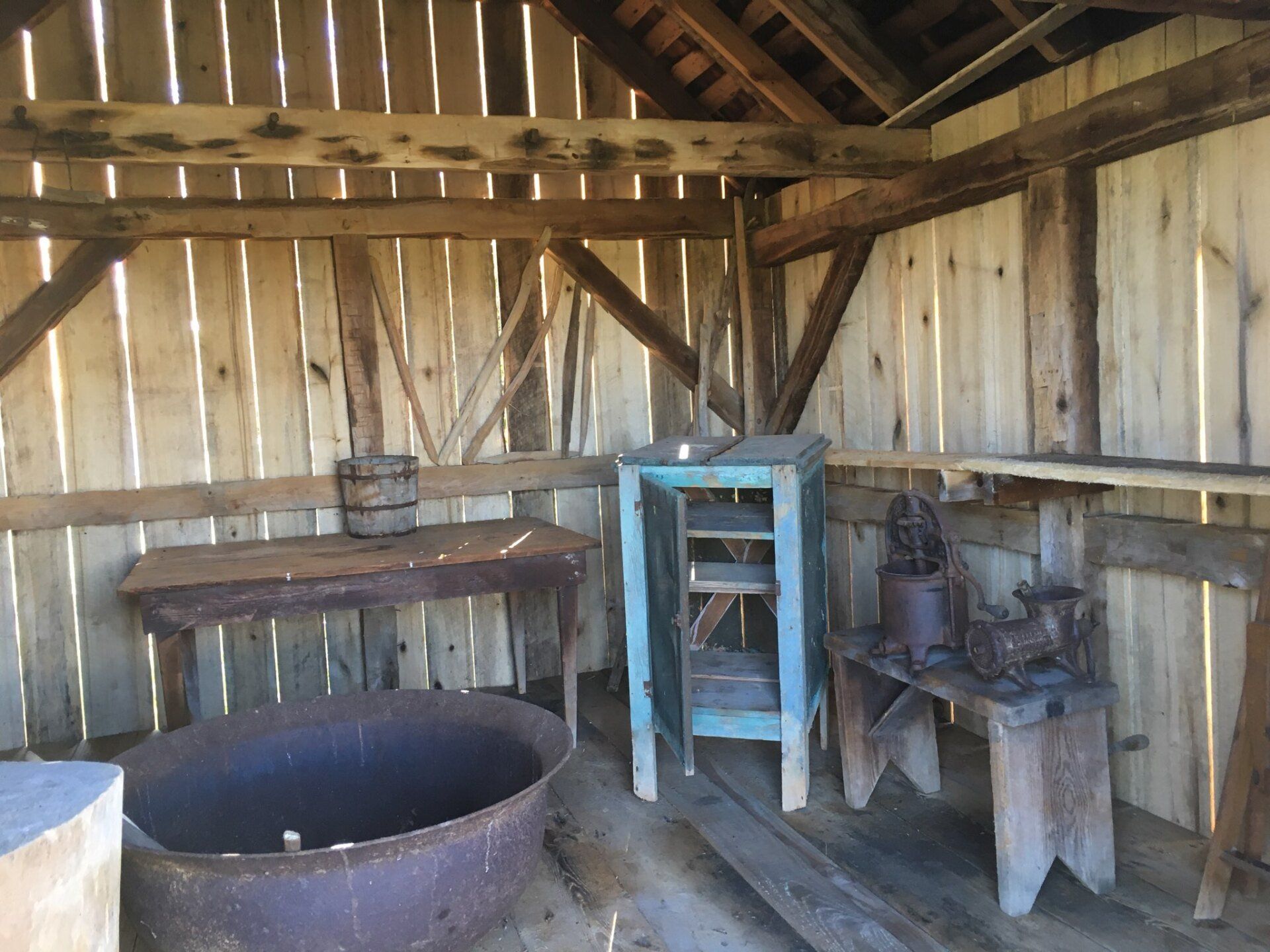 The Museum's smokehouse has a wood floor where a large pot stuffed with wood was ignited, smothered, and left to smolder.